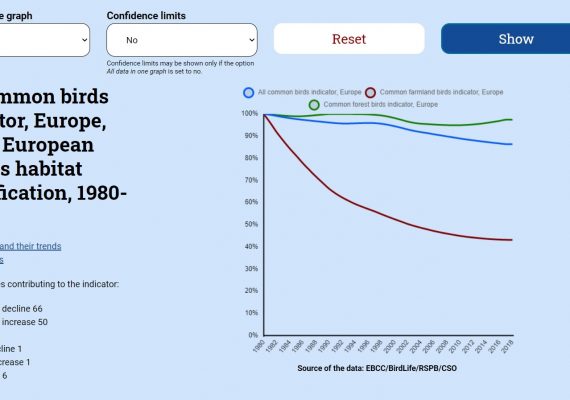 Therefore, information on the 2020 Indicators Update resembles the 2019 update. The indices of European common birds were used for computation of European indicators. For the computation of regional indicators for West, North, Central & East, and South Europe or EU, New and Old EU states, the regional and EU individual species indices were used, respectively. Although we produce European, EU and regional indices for 170 species, two species (Oenanthe cypriaca and Sylvia melanothorax) haven´t been included in the common bird indicators for Europe, EU, and regions since they are endemic species of Cyprus and so not common for the whole of Europe. Consequently, only 168 species are included in the common bird indicators. The number of species included in the common farmland bird indicators (39 farmland species) and common forest bird indicators (34 forest species) for Europe and the EU remained the same as last year.