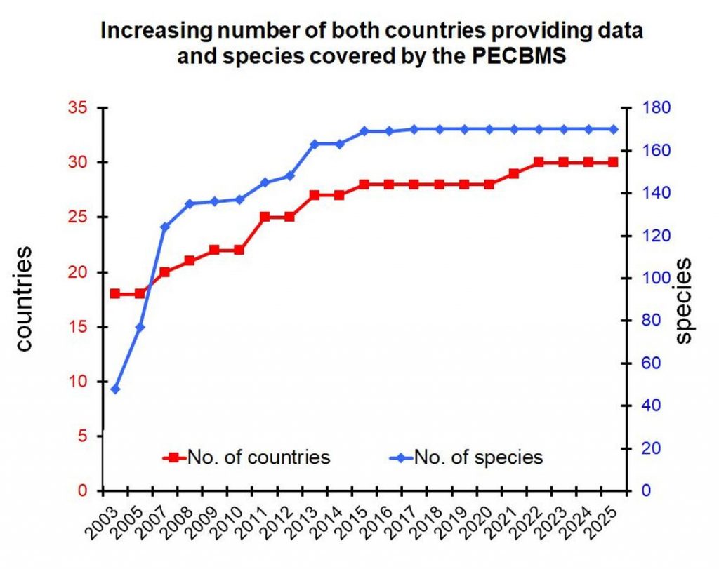 The number of countries contributing to the PECBMS has increased since 2003 from 18 to 30. Moreover, monitoring schemes have been established in some new countries recently, and we expect their contribution to the PECBMS soon. The species number for which the PECBMS produces trends and indices has increased, too. It has almost tripled since 2003 (see graph below).